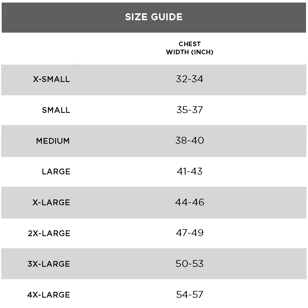 | Chest Width | 18 1/2 | 20 | 21 1/2 | 23 | 24 1/2 | 26 | 28 | 30 |