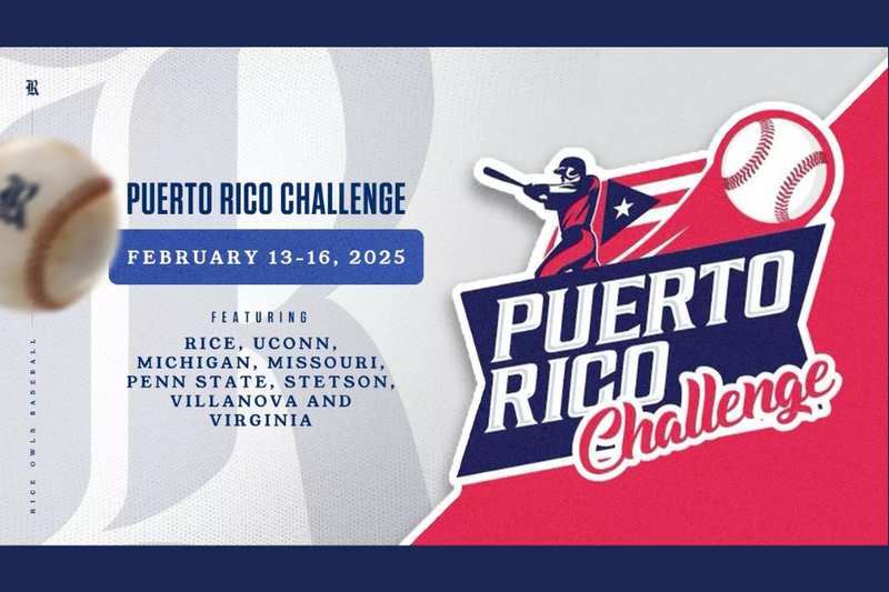 January 11, 2024 Houston, Tx. -- Rice will open the 2025 baseball season in a unique setting as the Owls are one of eight college baseball teams who have been selected to play in the Puerto Rico. The Owls will be joined in the first collegiate baseball event of its kind on the island by UConn, Michigan, Missouri, Penn State, Stetson, Villanova, and Virginia.
